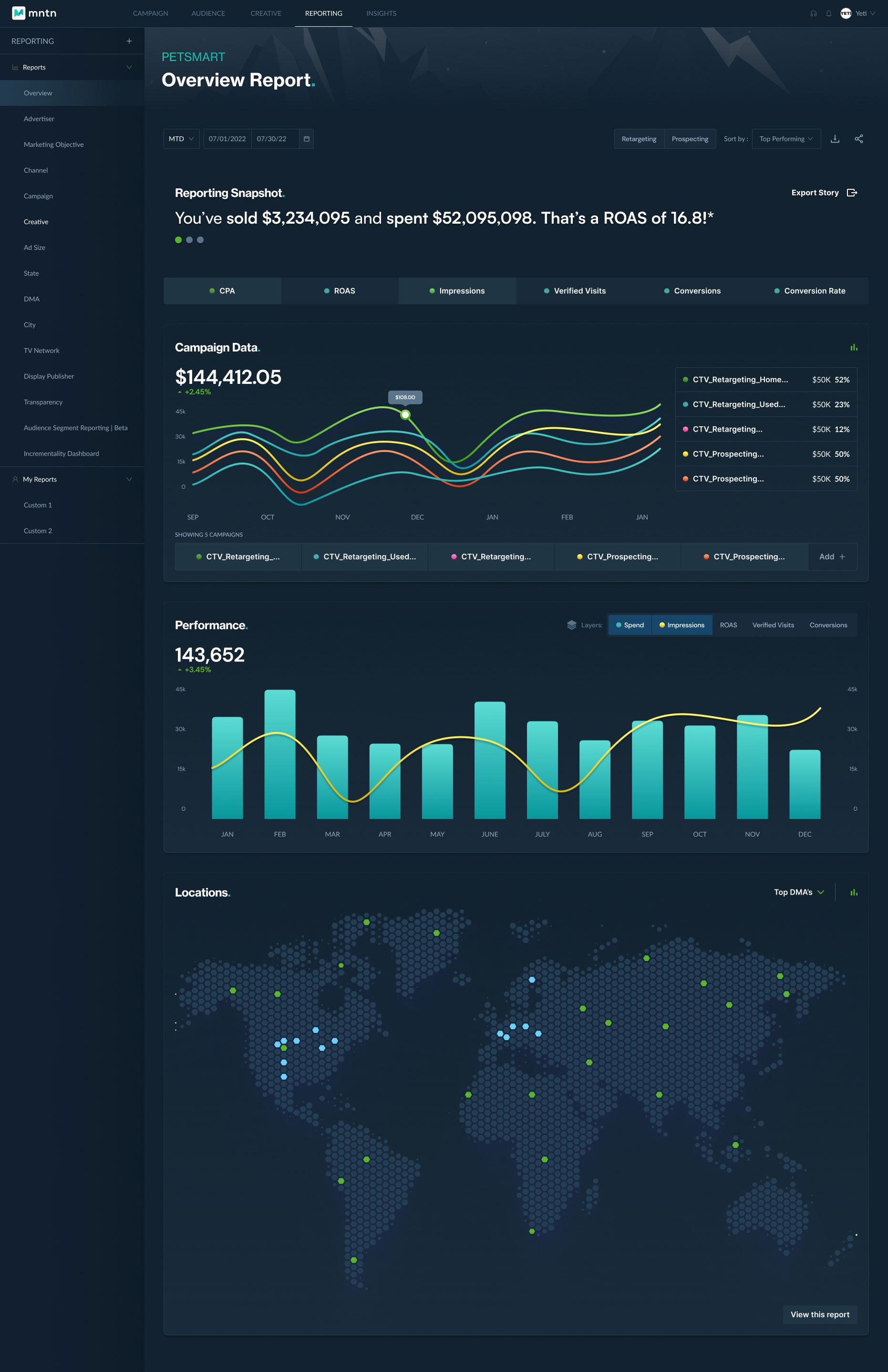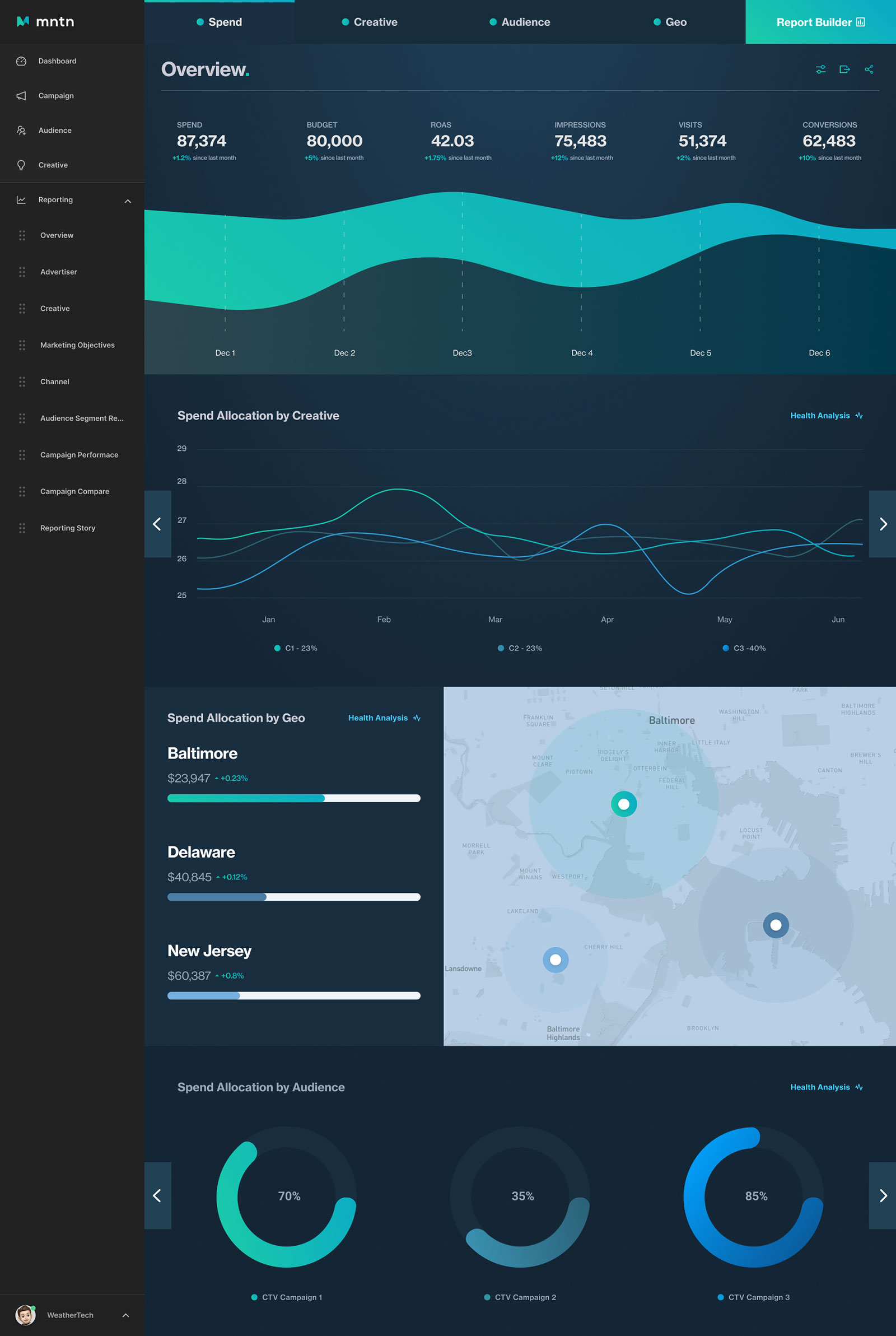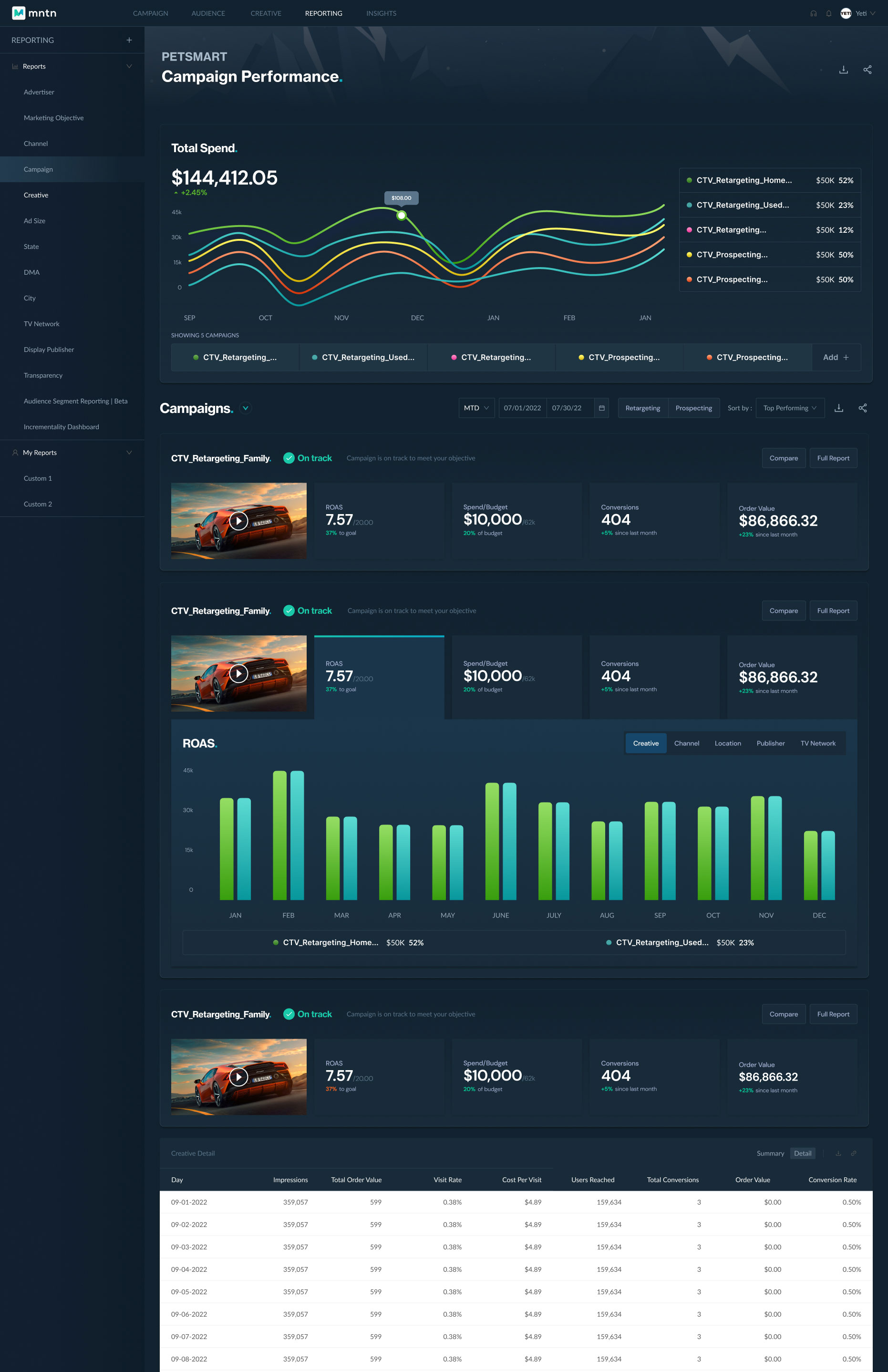 At MNTN, I led the design of the Reporting Concepts project, aiming to enhance how users track and analyze the performance of their advertising campaigns. The primary challenge was to create an intuitive interface that accommodates diverse user preferences and presents complex data in a clear, actionable format.